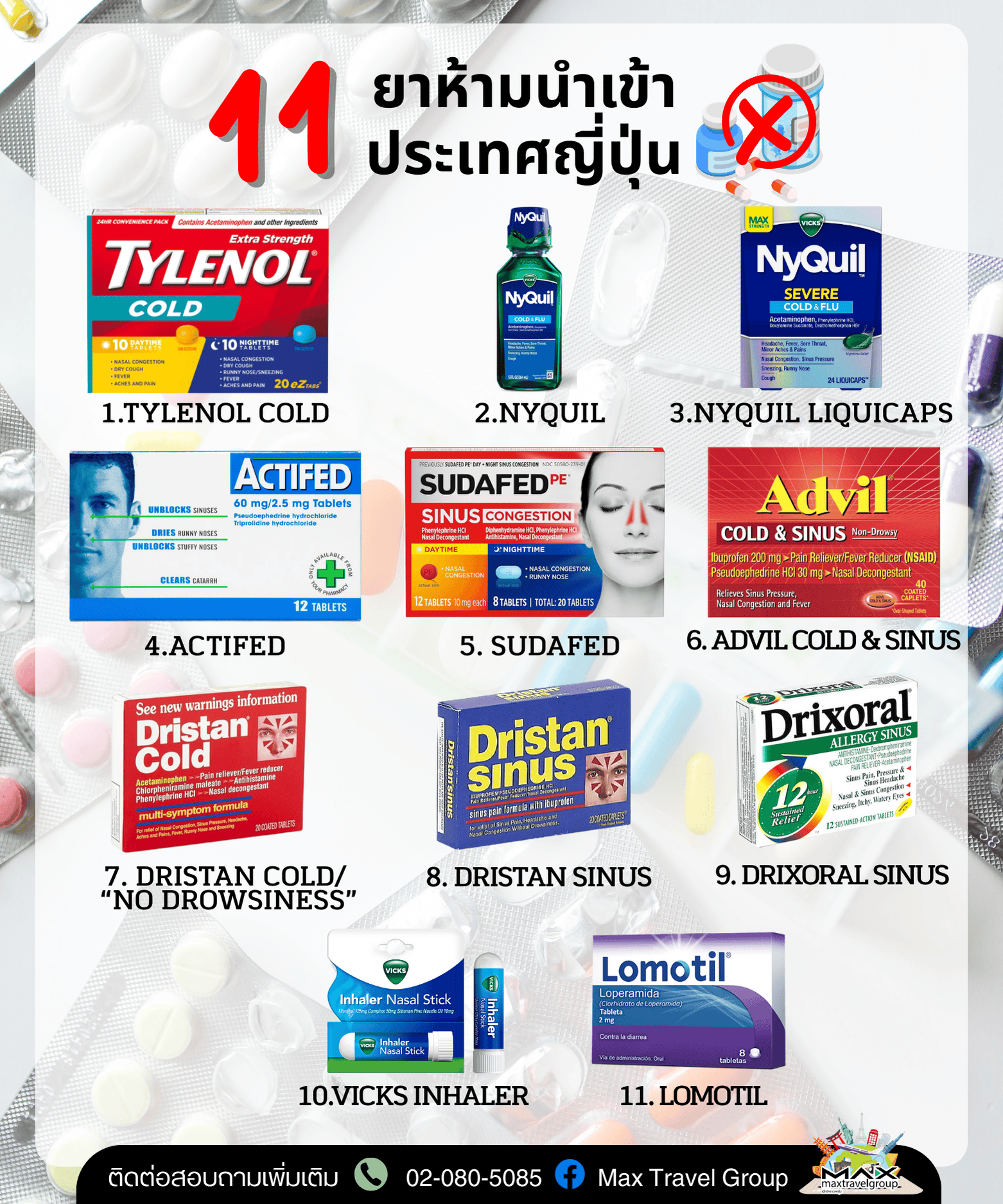 ก่อนที่จะเดินทางไปเที่ยวประเทศญี่ปุ่น เตรียมตัวแค่กระเป๋าเสื้อผ้า ของใช้ เอกสารยังไม่พอ ต้องศึกษาข้อมูล กฎระเบียบ และสิ่งของที่ห้ามนำเข้าประเทศญี่ปุ่น ที่สำคัญผู้ที่มีโรคประจำตัว ต้องพกยา ควรเช็คและระวังเป็นอย่างยิ่ง จะได้เตรียมตัวให้พร้อมอย่างถูกต้องแบบไม่ทำผิดกฎหมาย วันนี้ แม็กซ์ทราเวลจะพาทุกคนไปรู้ 11 ตัวยาที่ห้ามนำเข้าประเทศญี่ปุ่นกันค่ะ